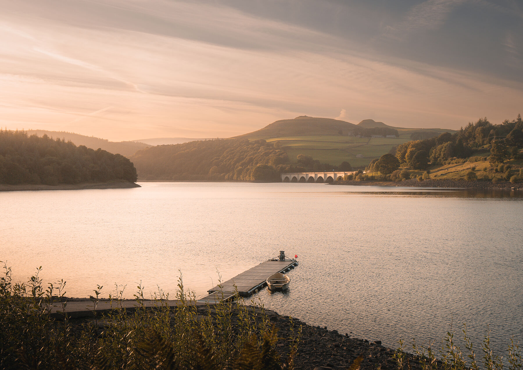 This Ladybower Jetty fine art print captures a calm golden-hour moment on the water, as the setting sun washes across the reservoir and the distant arches glow softly in the fading light. The still jetty and lone boat create a quiet focal point against the sweeping Peak District landscape.